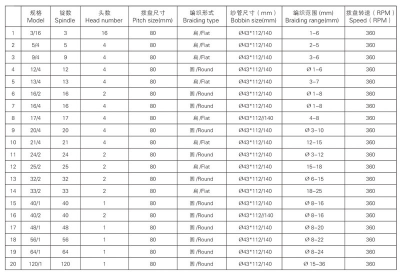 設備簡介:我公司生產的 80 系列高速編織機被廣泛的用于編織各種圓的或者扁的繩帶(鞋帶、手提帶、拖車繩、行李繩、釣魚線、玻纖管、高壓膠管、裝飾繩、松緊帶等)和電線電纜(高溫導線、屏蔽線等)。