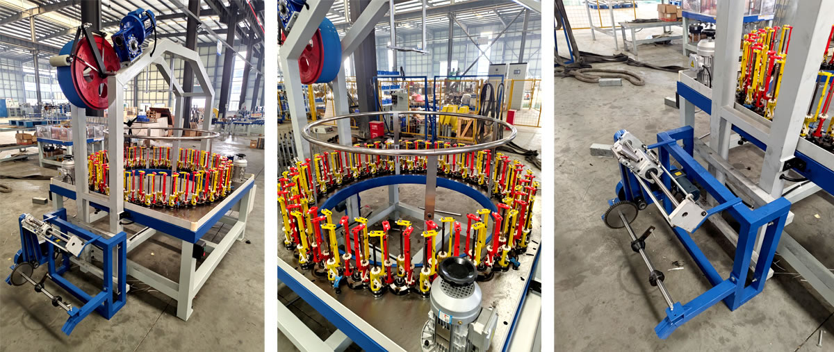 含收線,撐線盤,中心芯管,380V,三相,信捷,90錠子0.6簧,47*142mm紗管,可纏繞膜密封,現場安裝調試,額外帶0.5彈簧。1.龍門架,大寬平滾筒+雙壓輥,雙槽分線輪,后帶雙壓落線。2.帶不銹鋼撐線圈。3.90彈錠,裝0.6簧,另送0.5簧。4.編織電機0.75KW*2,牽引電機0.75KW*1,雙變頻調速。5.帶收排線架,120W收線電機,適用標準500線盤。